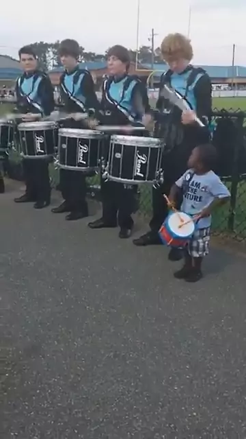 Simplicidade de uma criança toda feliz acompanhado a banda de fanfarra