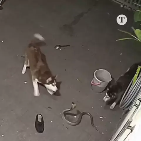 Cachorros lutam contra serpente, e cobra ataca um deles Descrição Um vídeo impressionante de uma câmera de segurança instalada em um quintal de uma casa mostram dois cachorros da raça husky siberiano lutando contra uma serpente. O caso foi registrado na Tailândia.