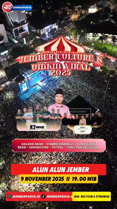 9 November 2025 ๐ 18.00 โ Selesai ๐ Alun-Alun Jember Nusantara ๐ค Guest Star: K2 Reggae ๐ญ Spesial Perform: Dalang Anak, Combo Dangdut, Karawitan, Reog, Keroncong, Patrol, Tonil Pandalungan ๐ธ Gratis & Terbuka untuk Umum! @gusfawait #umkm #k2reggae #Gusfawait #TerimaKasihGusFawait #alunalunjember