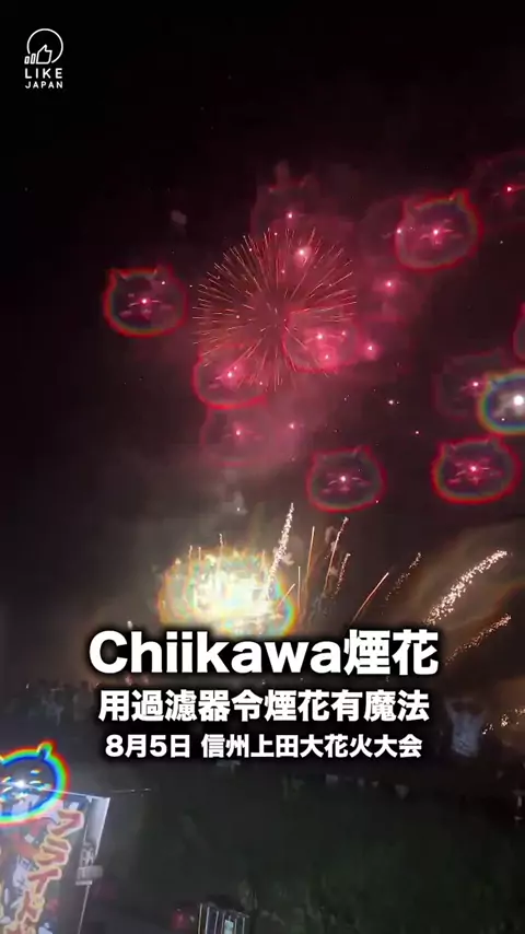 上年我們買了一份Chiikawa煙花去玩,而在煙花中有一個Chiikawa過濾器,它可以令鏡中的光變成Chiikawa,非常神奇w 我們最近就拿了這個filter去看信州上田大花火大会! *信州上田大花火大会是在長野縣上田市舉行的煙花大會,大會中總共有8000發煙火。當中一個大環節就是三家煙花公司競演的環節,讓大家使出最大的技術與創造力去做的強大表演。 信州上田大花火大会 時間:8月5日晚上7時 地點:千曲川河川敷 (常田新橋下流)