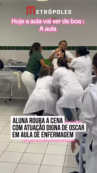 🎭 Durante a atividade, as alunas de enfermagem simulam a contenção de um paciente com transtorno mental, mas uma das estudantes resolve entregar tudo na atuação. A intensidade foi tanta que roubou completamente a cena e conquistou a internet. #KwaiNotícias 🤳 andrezza_goncalvesk3 (tk) | dommedia.br