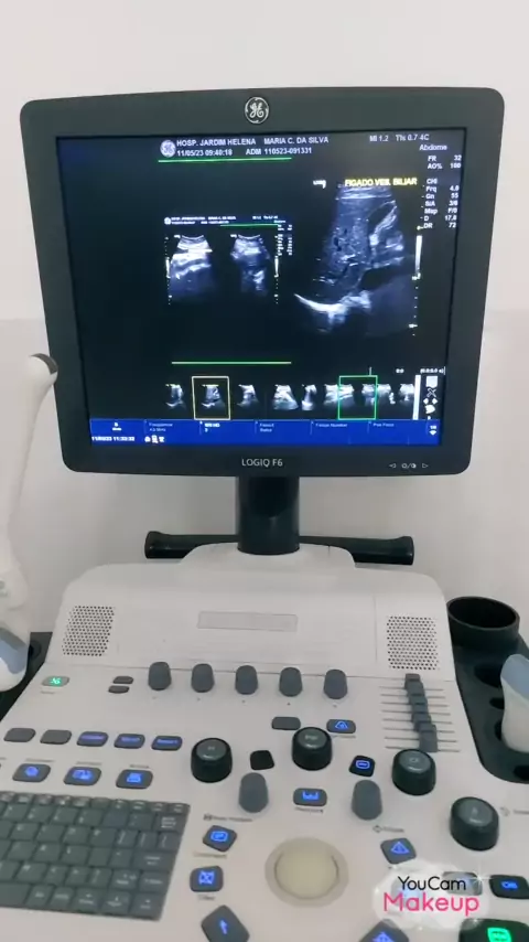 Dra Maria Rita mostrando um ultrassom de abdômen total