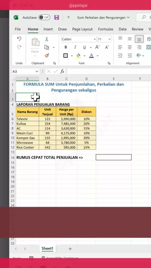Rumus SUM untuk Perkalian dan Penjumlahan Sekaligus #excel #exceltips #exceltipsandtricks #exceltricks #tipsexcel #exceltrick #belajarexcel #serunyabelajar #tutorialexcel #exceltutorial #excelpro #perkantoran #administrasiperkantoran #mahasiswa