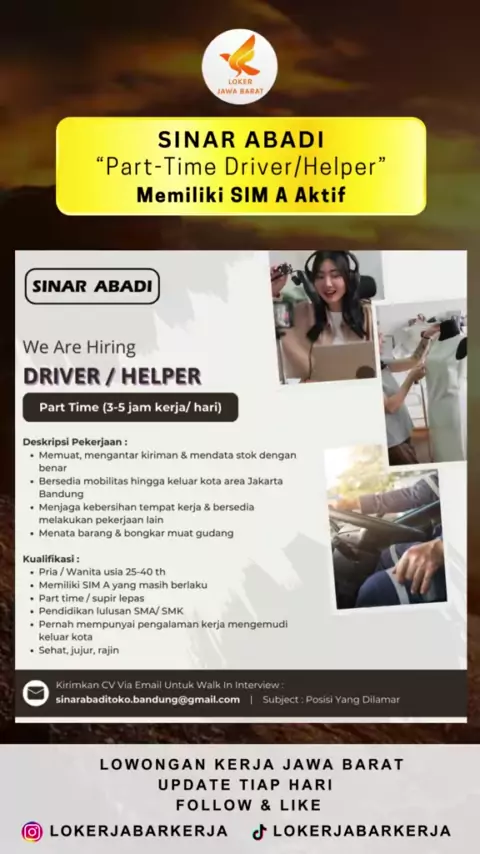 Lowongan Kerja Jawa Barat Terbaru. Posisi: Part-Time Driver/Helper Lokasi: Bandung#lokerdriver#lokersupir#lokersopir#lokerdriverbandung#pekerjaharianlepas#lokerparttime#parttime#lokerbandung#infolokerbandung#lokerbandung2024#carikerja2024#lokerjabar#lokerjabar2024#lokerjawabarat#lokerjawabaratterbaru#lowongankerja#lokerjabarupdate#lowongankerja2024#loker2024#infolokerjabar#lokersmp#lokersma#lokersmaterbaru#lokersmk#lokersmkterbaru#lokersmasmk