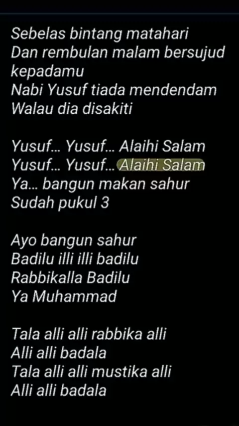 Sebelas bintang matahari Dan rembulan malam bersujud kepadamu Nabi Yusuf tiada mendendam Walau dia disakiti Yusuf... Yusuf... Alaihi Salam Yusuf... Yusuf... Alaihi Salam Ya... bangun makan sahur Sudah pukul 3 Ayo bangun sahur Badilu illi illi badilu Rabbikalla Badilu Ya Muhammad Tala alli alli rabbika alli Alli alli badala Tala alli alli mustika alli Alli alli badala #puasa #Ramadan2023