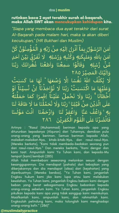 Inilah keutamaan membaca dua ayat terakhir surat Al-Baqarah (285-286). Baca secara rutin sebelum tidur, semoga kita selalu diberi kecukupan oleh Allah SWT. #keuatamaansurahalbaqarah #ayat285286 #muslimdailypractice