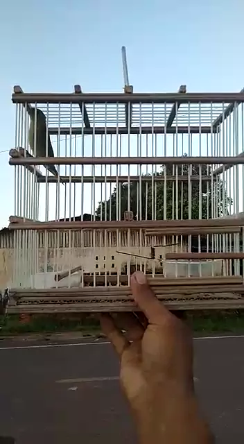 Bigodinho pardo cantando de gaiola na mão.