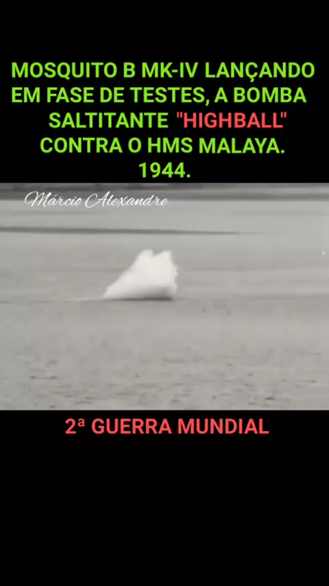 Mosquito B MK IV mirando no HMS Malaya durante um teste de lançamento duplo da bomba saltitante "Highball" sobre Loch Striven em maio de 1944.