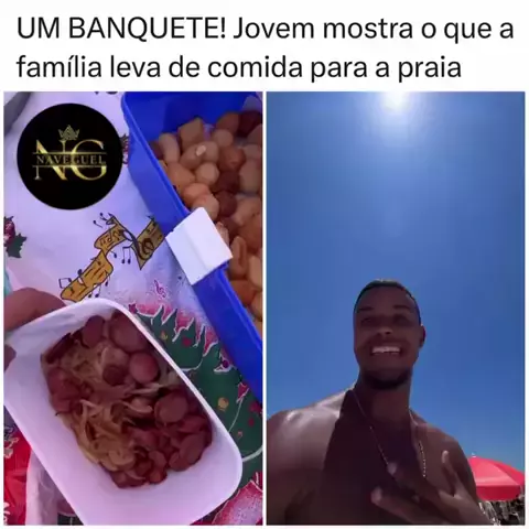 Gente, e eu que achava que levar um sanduíche natural era muito! 😂 Essa família não foi à praia, eles montaram um restaurante na areia! Quem aí também tem aquele parente que se deixar leva até o fogão? 🍗🏖️ #farofa #praia #banquete #familia #verao