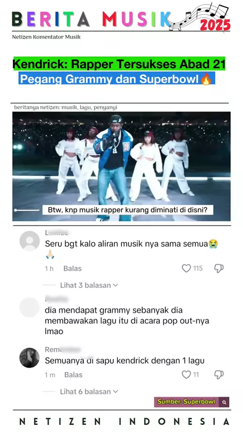 Kendrick Lamar, Rapper Tersukses 2025: Menang Grammy dan Tampil di Super Bowl Tahun 2025 menjadi momen emas bagi Kendrick Lamar, yang semakin mengukuhkan posisinya sebagai salah satu rapper paling berpengaruh di industri musik. Prestasinya di Grammy Awards dan penampilannya yang luar biasa di Super Bowl Halftime Show menjadikannya bintang utama tahun ini. Sapu Bersih Penghargaan di Grammy 2025: Dalam ajang Grammy Awards 2025, Kendrick Lamar berhasil memborong beberapa penghargaan bergengsi. Lag...