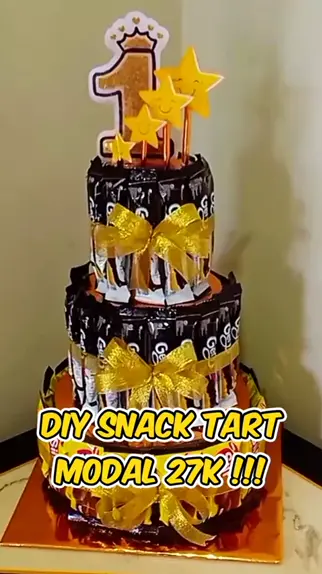 Snack tart tema kuning modal 27k!!! Snack siip 1 pack 9000, gery roll 1 pack 11000, print kertas hvs 1000, kertas emas 2 lembar 3000, pita emas 6m 2500, lainlain (kardus, solasi, doubletape) 500. Total 27000 #snacktart #kueultahsnack #kueultahanak #snacktowercake #kueulangtahun
