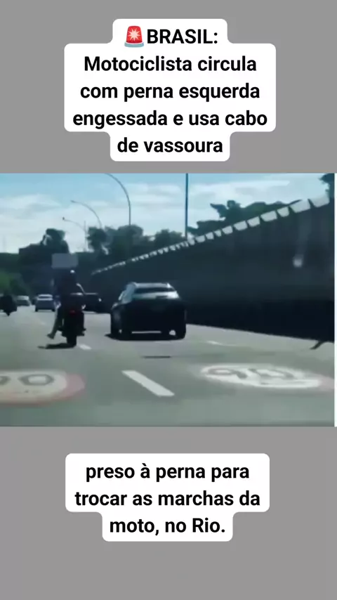 Motociclista circula com perna esquerda engessada e usa cabo de vassoura preso à perna para trocar as marchas da moto, no Rio. #Noticias #kwaiNoticas #UltimasNoticias #