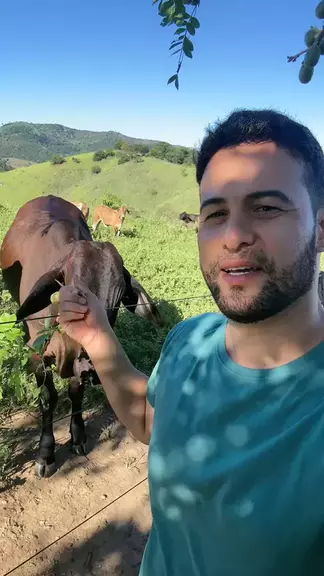 Meu amor você gosta dos animais como eu? Olha aqui essa vaca está comendo na minha mão.