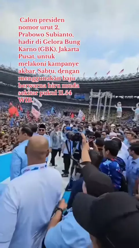 - Calon presiden nomor urut 2, Prabowo Subianto, hadir di Gelora Bung Karno (GBK), Jakarta Pusat, Sabtu,10 Pebruari 2024 untuk melakoni kampanye akbar, Sabtu, dengan menggunakan baju berwarna biru muda sekitar pukul 11.54 WIB.Sedang Cawapres Gibran R datang ke panggung menggunakam Motor Listrik #gibran #prabowopresiden2024 #02 #pemilihanpresiden2024 #gbksenayanjakarta #viralhariini # #presiden2024 #ahy #sby #gerindra #golkar #demokrat #demokrats14p #sorotan #pengikut #gbk #gbksenayan #gbksen...