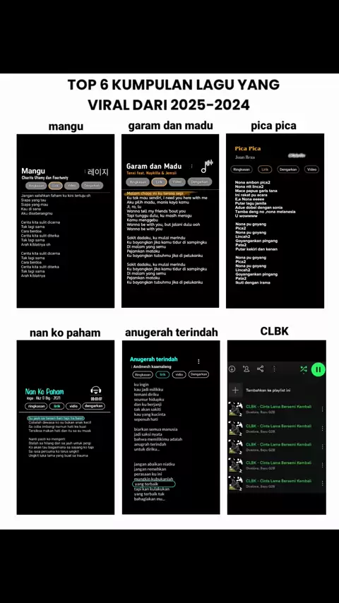 top 6 lagu yang viral dari tahun 2024-2025 #musicvideo #laguviral #2024 #2025 #mangu #garamdanmadu #picapica #nankopaham #anugerahterindah #clbk #сѓи #masukberanda #dongggggggg