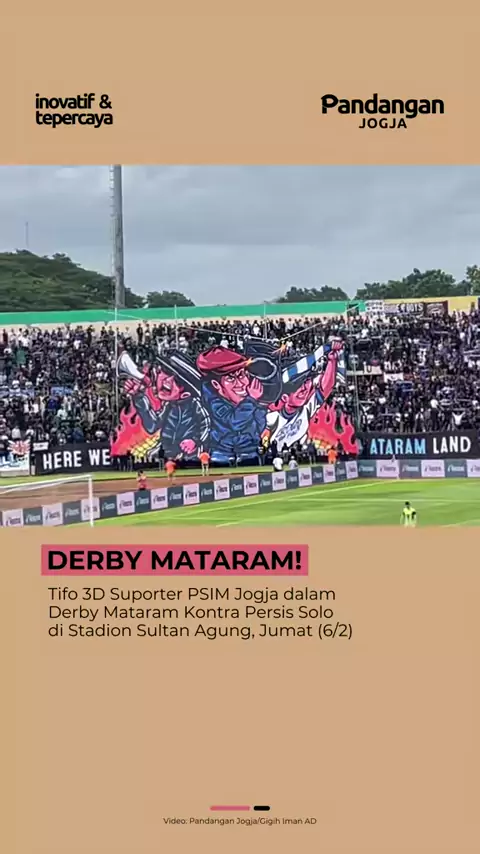 Suporter PSIM Jogja menampilkan tifo tiga dimensi (3D) di tribun utara Stadion Sultan Agung (SSA) Bantul saat PSIM menjamu Persis Solo dalam laga bertajuk Derby Mataram, Jumat (6/2). Pantauan Pandangan Jogja, tifo 3D itu menampilkan tiga animasi wajah dengan ekspresi gembira. Masing-masing figur digambarkan membawa atribut khas budaya tribun suporter, yakni sebuah toa, perangkat sound, dan slayer. Ketiga animasi tersebut disatukan dalam satu bentang visual dan digerakkan menggunakan empat tian...