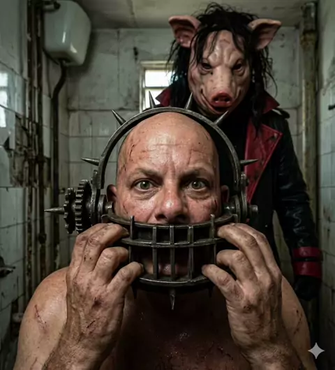@sfel Leurin:2..The device leaves the eyes, part of the nose, and part of the cheeks visible, but completely blocks the mouth. The design suggests that it: immobilizes the jaw limits head movement. General Appearance The device has an industrial, heavy, and menacing aesthetic. It appears to be constructed from thick iron, mechanical parts, and machine components. It gives the impression of being a mechanism designed to trap or restrain, rather than simply protect. It is a mechanical helmet, a me