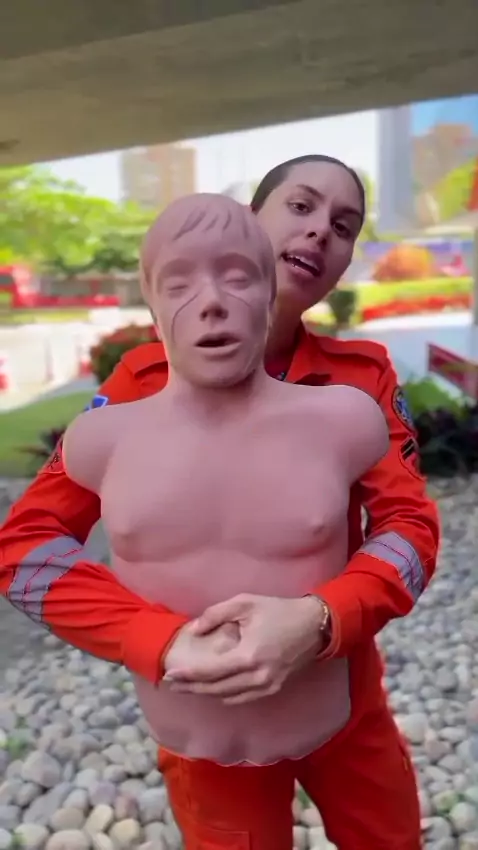 a manobra do desengasgo mudou! e 5 tapas nas costas coma a profissional mostra e 5 compressão no estômago assim como mostrado no vídeo