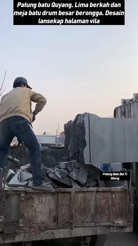 Patung batu Quyang. Lima berkah dan meja batu drum besar berongga. Desain lansekap halaman vila