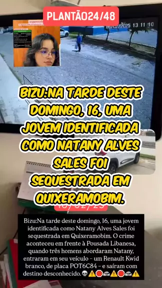Bizu:Na tarde deste domingo, 16, uma jovem identificada como Natany Alves Sales foi sequestrada em Quixeramobim. O crime aconteceu em frente à Pousada Libanesa, quando três homens abordaram Natany, entraram em seu veículo – um Renault Kwid branco, de placa POT6C84 – e saíram com destino desconhecido.💀⚠️🛑🚔⚠️🛑🚔⚠️ #ultranotícia #noticiasdeultimahora #últimasnotícia #ceara3xmaisforte #flagrante