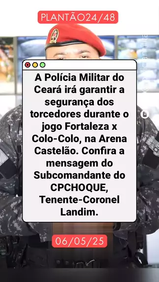 A Polícia Militar do Ceará irá garantir a segurança dos torcedores durante o jogo Fortaleza x Colo-Colo, na Arena Castelão. Confira a mensagem do Subcomandante do CPCHOQUE, Tenente-Coronel Landim. #ceara3xmaisforte #notícia #últimasnotícias #notícia #noticiasdeultimahora