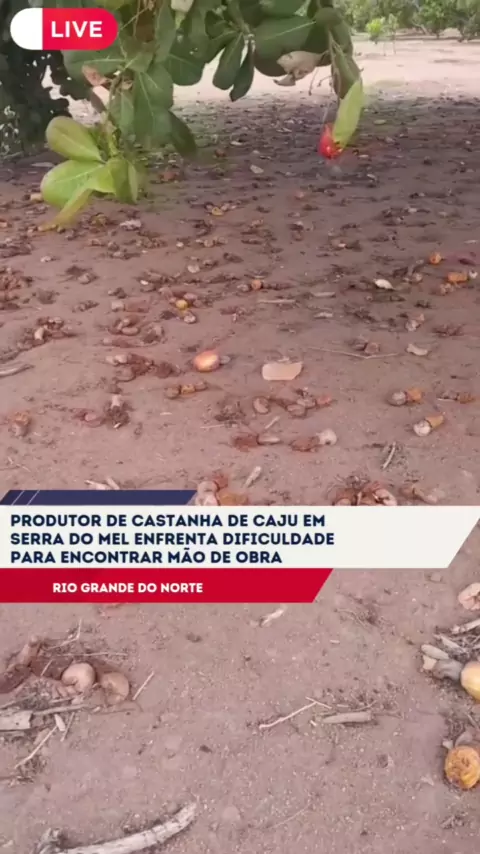 Produtor de Castanha de Caju em Serra do Mel Enfrenta Dificuldade para Encontrar Mão de Obra O produtor de castanha de caju conhecido como "Babau", de Serra do Mel-RN, utilizou suas redes sociais para expor uma dificuldade crescente em sua atividade: a escassez de trabalhadores para a colheita das castanhas. Em um vídeo, ele mostrou campos repletos de cajueiros carregados e castanhas espalhadas pelo chão, à espera de serem colhidas.