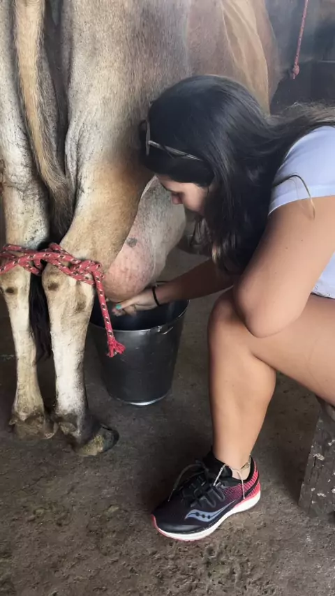 Tirando leita da vaca. Pessoal da cidade não perde a oportunidade de se sentir na roça. • #leite #tirandoleitenaroça #vaca #roça More
