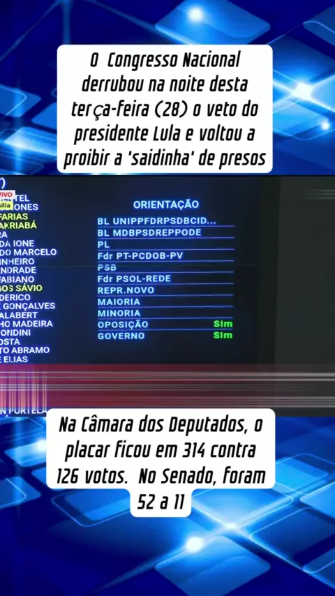 O Congresso Nacional derrubou na noite desta terça-feira (28) o veto do presidente Lula e voltou a proibir a 'saidinha' de presos temporariamente #noticias #politica #fy #kwai #viral