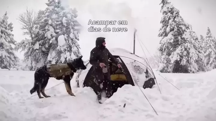Pessoa um cão acampado na neve # camping nevado # camping selvagem