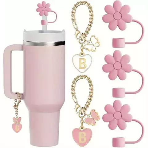 5PCS Tampa de Canudo Tampa de Canudo e Encantos de Letras para Stanley 30 e 40 Oz Copo com Alça - Dia dos Namorados, Dia das Mães, Natal, Ação de Graças, Acessórios para o Dia da Mulher🥰 🔥Disponível em todas as letras do alfabeto 🔥Link nos stories e bio #temu #stanley #copostanley #coporosa #pingentepracopo