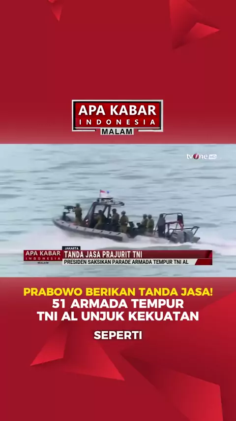 Presiden Prabowo Subianto memimpin Presidential Inspection dan penganugerahan tanda jasa kehormatan kepada 18 prajurit TNI di atas KRI Dr. Rajiman Wedo Ningrat. Presiden berangkat dari Pelabuhan Tanjung Priok menuju Teluk Jakarta bersama jajaran kabinet dan Panglima TNI Jenderal Agus Subianto. Sebanyak 6 gelar Yuda Dharma Prataba dan 12 gelar Samkarya Nugraha disematkan kepada prajurit dari ketiga matra TNI yang dinilai mengabdi melampaui tugas. Presiden juga menyaksikan parade 51 unsur armada ...
