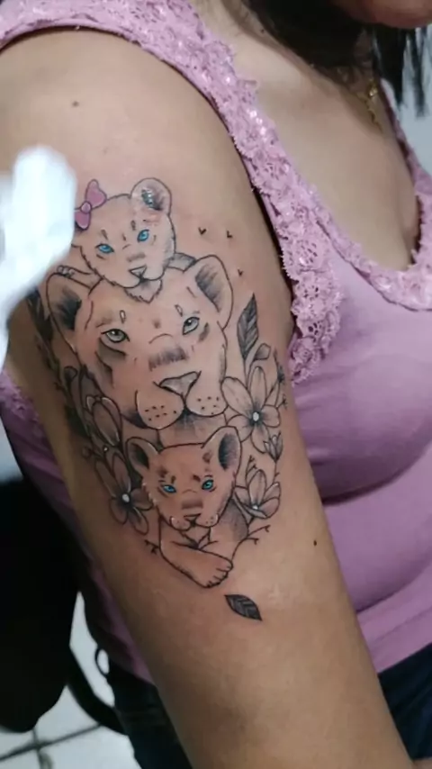 Tattoo Leoa filhotes 👍😎 #kwai #viral #tattoodelicada segue no Instagram rafatattooestudio 👍😎😎