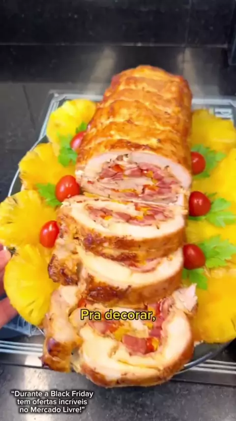 Lombo recheado com Abacaxi 🍍 ✨Ingredientes: 1,2kg de lombo suíno 200g de bacon 1 calabresa Pimentão verde e pimentão amarelo ✨Marinada do Lombo: 4 dentes de alho 1 limão 2 colheres de mostarda 2 colheres de shoyu Sal Páprica picante Chimichurri Pimenta calabresa ✨Abacaxi caramelizado: 1/2 abacaxi com rodelas 1 xícara de açúcar ✨Molho de abacaxi: 2 colheres de manteiga 1/2 abacaxi picado 2 colheres de açúcar #Receita #receitas #Natal #kwai #viral