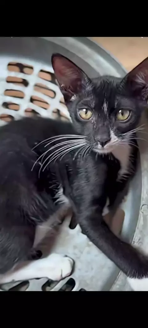 1 finger pointing at the cat, 3 fingers pointing at the cat's owner