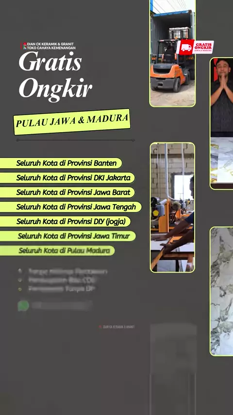 Granit motif onix terbaru ukuran kulkas Alias besar. Ukuran 80 × 160 sudah glazed polish Dengan kualitas pertama. Satu dus isi dua lembar dengan diameter 2,56 m². Cocok untuk seluruh ruangan ruangan per meter harganya cuma 162 500 per dus nya cuma 416.000. Gratis ongkir seluruh pulau Jawa dan Madura. Pembayarannya bisa COD tanpa DP dan tanpa Minimal Pembelian #freeongkir #ceramics #rectifiedtiles #keramik #keramiklantai #promo #keramikmurah #tokokeramiksukoharjo #keramiksolo #keramikjawatengah ...