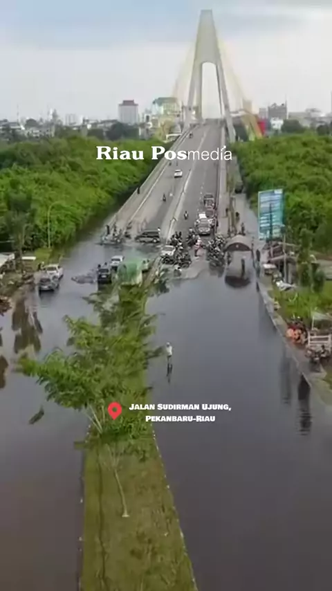 Luapan Sungai Siak sebabkan Jalan Jenderal Sudirman Ujung, tepatnya setelah Jembatan Siak IV tergenang banjir. Akses jalan dari arah kota ke rumbai maupun sebaliknya terputus, Rabu (5/2/2025). #banjir #banjirpekanbaru #jembatansiak #pekanbaru #riauposmedia #riaupos