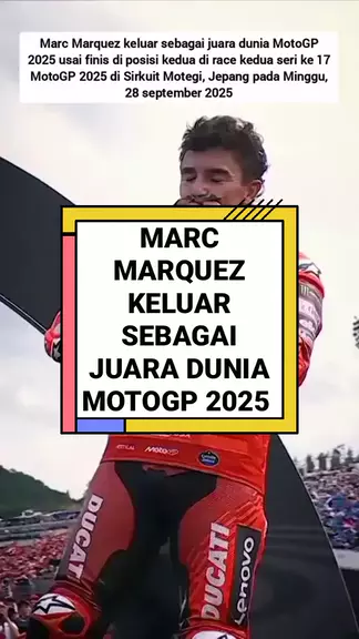 Marc Marquez keluar sebagai juara dunia MotoGP 2025 usai finis di posisi kedua di race kedua seri ke 17 di Sirkuit Motegi, Jepang pada Minggu, 28 september 2025, ini merupakan gelar juara dunia yang ke 9 di semua kelas dunia balap motor dan gelar yang ketuju kelas MotoGP yang diraih Marquez sepanjang karirnya. #MotoGP2025 #MarcMarquez #DucatiLenovo #SnackCerdaskanDesa