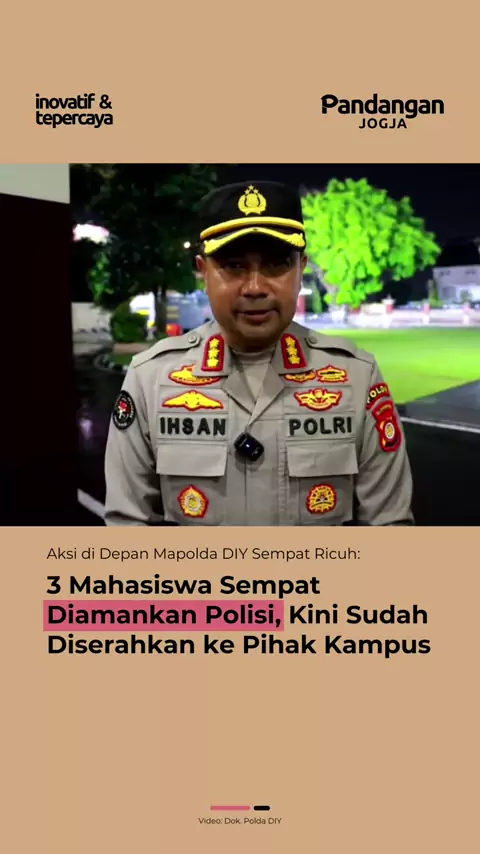 Aksi demonstrasi di Mapolda DIY, Selasa (24/2) malam sempat ricuh. Tiga orang mahasiswa peserta aksi juga sempat diamankan polisi, namun saat ini telah dikembalikan kepada pihak kampus. “Tadi sekitar jam 22.30 WIB, kami telah menyerahkan kepada pihak rektorat yang sebelumnya kami hubungi, kami koordinasikan untuk menjemput mahasiswanya,” ujar Kabid Humas Polda DIY, Kombes Pol Ihsan, dalam keterangan resminya, Selasa (24/2). Terkait jalannya aksi, Ihsan menyayangkan unjuk rasa yang awalnya berla...