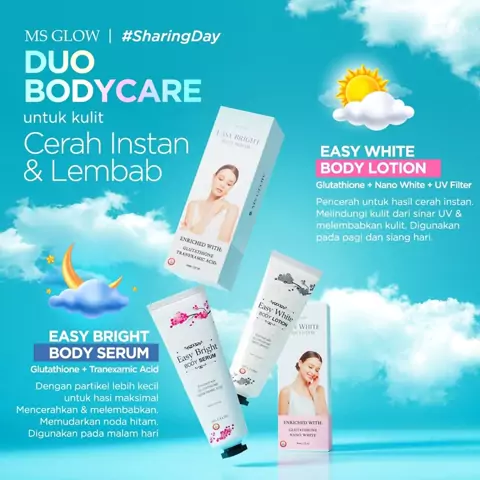 ✨ Easy Bright Body Serum (Digunakan malam hari)⁠ ✨ Easy White Body Lotion (Digunakan pagi/siang hari)⁠ ⁠ #msglow #msglowbeauty #easywhitebodyseries #GlowItOn #bodycare More