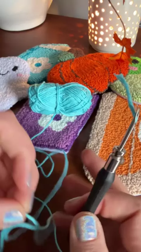 you should’ve seen how bad my first attempts were😂🧶✨#punchneedle#mugrugs#diykits#craftkitsforadults#crafttok#craftygirls#cozycrafts#relaxinghobby#adhdcrafter#deskdecor#punchneedletips#