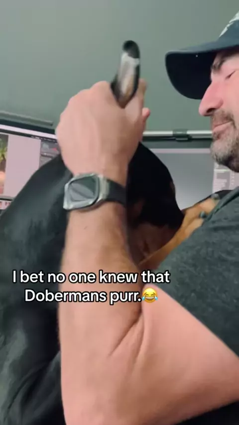 He shoves him nose so deep into my chest when I scratch his ears and head that he purrs when he breathes lol.#Brucethedoberman#doberman#dobermann#rubydooby_do#dogsof