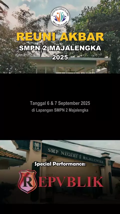 Siap-siap nostalgia bareng di REUNI AKBAR SMPN 2 MAJALENGKA ๐ถ ๐ SMPN 2 Majalengka ๐ Minggu, 7 September 2025 Jangan sampai ketinggalan momen spesial ini! ๐ฅ Ajak semua sahabat, teman lama, dan keluarga untuk nyanyi bareng lagu-lagu hits REPVBLIK! ๐คโค๏ธ #Repvblik #ReuniAkbar #Majalengka
