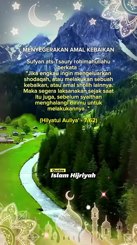#creatorsearchinsights 💚MENYEGERAKAN AMAL KEBAIKAN💚 Sufyan ats-Tsaury rohimahullahu berkata : "Jika engkau ingin mengeluarkan shodaqah, atau melakukan sebuah kebaikan, atau amal sholih lainnya. Maka segera laksanakan sejak saat itu juga, sebelum syaithan menghalangi dirimu untuk melakukannya.." (Hilyatul Auliya' - 7/62) 🕋 Quotes Islam Hijriyah Edisi Ahad, 09 Jumadil Akhir 1447 H / 30 November 2025 M #QuotesIslam #ShareDakwah #KalenderHijriyah #AmalKebaikan @Rusman Raymanda @user2097943469304...