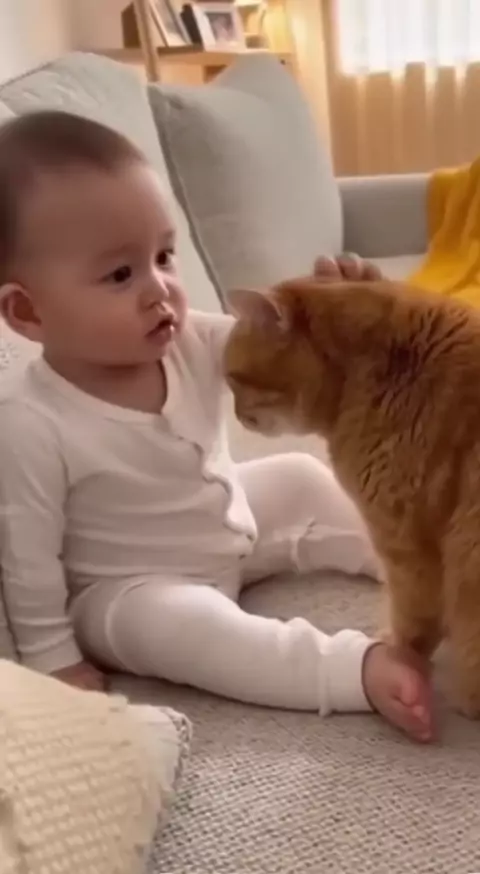 “Bayi kecil ini sedang memberi nasihat penuh cinta pada si kucing: ‘jadi anak baik ya, jangan nakal lagi…’ 😄🐾 Hatinya tulus, nasihatnya manis!” #BayiDanKucing #MomenLucu #SahabatKecil #NasihatManis #GemesinBanget