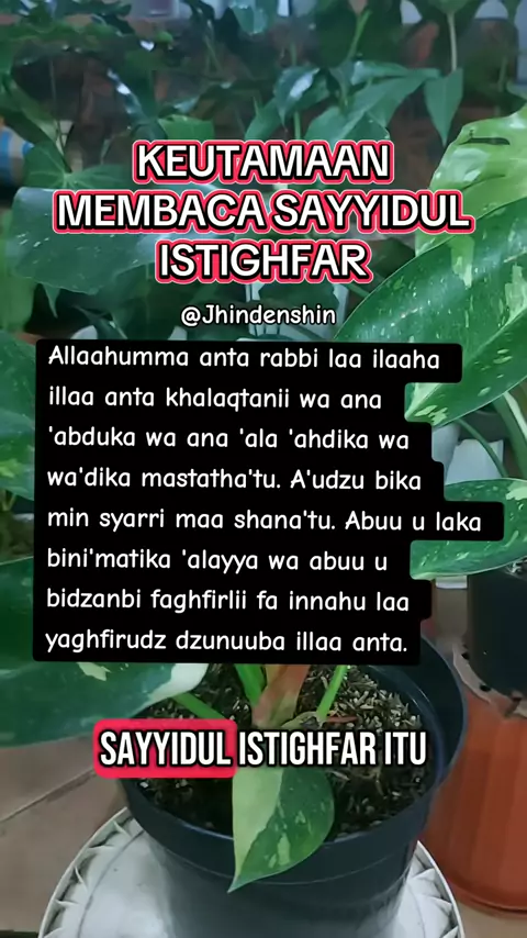 Assalamualaikum๐Ÿ™ SAYYIDUL ISTIGJFAR ุงู„ู„ูŽู‘ู‡ูู…ูŽู‘ ุฃูŽู†ู’ุชูŽ ุฑูŽุจูู‘ูŠ ู„ูŽุง ุฅูู„ูŽู‡ูŽ ุฅูู„ูŽู‘ุง ุฃูŽู†ู’ุชูŽ ุฎูŽู„ูŽู‚ู’ุชูŽู†ููŠ ูˆูŽุฃูŽู†ูŽุง ุนูŽุจู’ุฏููƒูŽ ูˆูŽุฃูŽู†ูŽุง ุนูŽู„ูŽู‰ ุนูŽู‡ู’ุฏููƒูŽ ูˆูŽูˆูŽุนู’ุฏููƒูŽ ู…ูŽุง ุงุณู’ุชูŽุทูŽุนู’ุชู ุฃูŽุนููˆุฐู ุจููƒูŽ ู…ูู†ู’ ุดูŽุฑูู‘ ู…ูŽุง ุตูŽู†ูŽุนู’ุชู ุฃูŽุจููˆุกู ู„ูŽูƒูŽ ุจูู†ูุนู’ู…ูŽุชููƒูŽ ุนูŽู„ูŽูŠูŽู‘ ูˆูŽุฃูŽุจููˆุกู ู„ูŽูƒูŽ ุจูุฐูŽู†ู’ุจููŠ ููŽุงุบู’ููุฑู’ ู„ููŠ ููŽุฅูู†ูŽู‘ู‡ู ู„ูŽุง ูŠูŽุบู’ููุฑู ุงู„ุฐูู‘ู†ููˆุจูŽ ุฅูู„ูŽู‘ุง ุฃูŽู†ู’ุชูŽ Artinya : Ya Allah, Engkau Tuhanku, tidak ada Tuhan selain Engkau, Engkau menciptakanku dan aku adalah hamba-Mu. Aku akan setia pada perjanjianku dengan Engkau dan aku berjanj... Mais