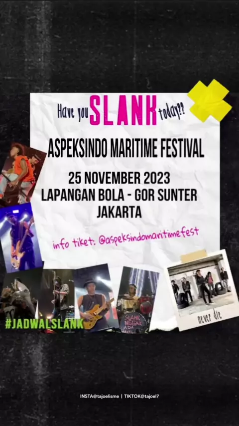 #JADWALSLANK ‼️ Sampai jumpa di ASPEKSINDO MARITIME FESTIVAL 2023 tanggal 25 November 2023 di GOR Sunter Jakarta Utara. Selain nonton konser, kalian juga bisa menikmati sajian makanan khas daerah dan sajian hidangan laut special dengan berbagai macam menu dalam Festival Kuliner Maritim. Tiket konser Slank dapat dibeli di @tiketapasajacom @loketcom dan @kiostix Jangan sampai ketinggalan ya! ° ° ° #Slank #Slanky #Konser #Slankers #KakaSlank #InfoKonser #RidhoSlank #AspekSindo #IvankaSlank #Ab...