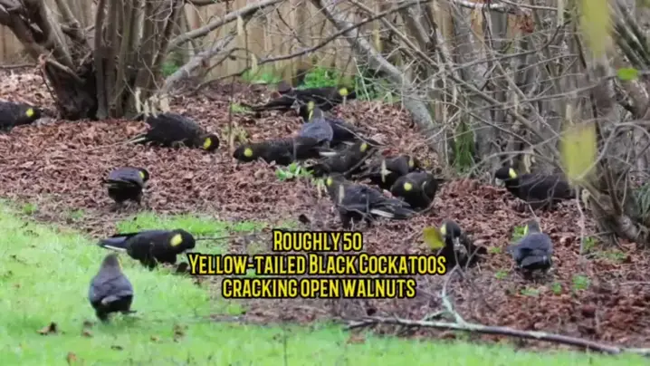 Roughly 50 Yellow-tailed Black Cockatoos (Calyptorhynchus funereus) cracking open walnuts in walnut grove Northern Tasmania, Australia. Mid winter. #Burungkakaktua #kakaktua #burung #burungkuburungmumana #mukbang