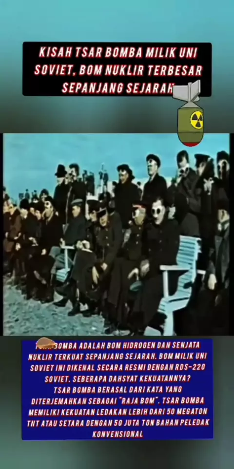 Kisah Tsar Bomba Milik Uni Soviet, Bom Nuklir Terbesar Sepanjang Sejarah Tsar Bomba adalah bom hidrogen dan senjata nuklir terkuat sepanjang sejarah. Bom milik Uni Soviet ini dikenal secara resmi dengan RDS-220 Soviet. Seberapa dahsyat kekuatannya? Tsar Bomba berasal dari kata yang diterjemahkan sebagai "Raja Bom". Tsar Bomba memiliki kekuatan ledakan lebih dari 50 megaton TNT atau setara dengan 50 juta ton bahan peledak konvensional #bom #nuklir #trending #fyp More