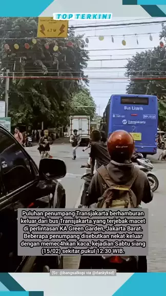 Puluhan penumpang Transjakarta berhamburan keluar dari bus Transjakarta yang terjebak macet di perlintasan KA Green Garden, Jakarta Barat. Beberapa penumpang disebutkan nekat keluar dengan memec4hkan kaca, kejadian Sabtu siang (15/02) sekitar pukul 12.30 WIB.