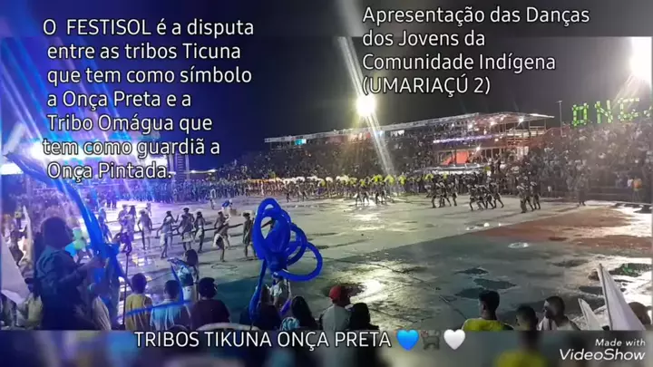 #O FESTISOL é a disputa entre as tribos Ticuna que tem como símbolo a Onça Preta e a Tribo Omágua que tem como guardiã a Onça Pintada. # @Flamenguista aleatório(O150001629089788) #Tribos Tikuna Onça Preta 💙🤍🐈⬛ #festakwai #Fogos #MinhaCidade